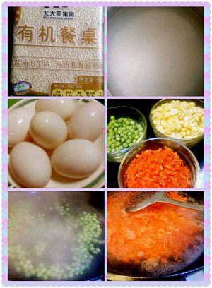先将生咸鸭蛋买回来洗净待用。糯米买回来洗净,用清水浸泡4小时以上,沥干水分待用,同时把胡萝卜切碎、甜玉米、豌豆洗净待用。