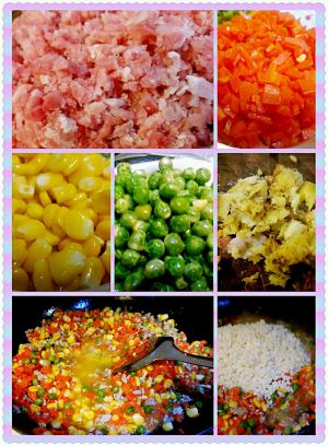热锅,倒油,油热后倒入猪肉未炒熟、倒入甜玉米、豌豆、胡萝卜拌匀,再倒入浸泡好的糯米,放少许的盐、蚝油,翻炒均匀后关火。