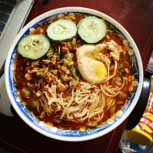 6加入面条(这时候再适当加水 同第五步调整咸淡)焖煮30秒在锅中打鸡蛋(直接将鸡蛋打到锅里鸡蛋会更入味)7继续焖煮直至熟