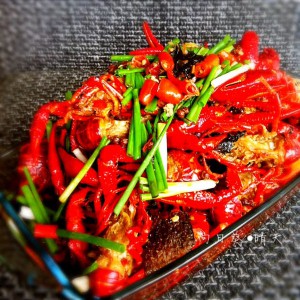 油中加豆瓣辣椒爆香,再加小米辣椒和紫苏叶翻炒,最后加调料:生抽,老抽,糖,盐,鸡精。