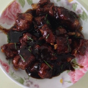 少油,加蒜和炸过的排骨翻炒一会后,加料酒,生抽,糖,醋,炒匀后加水盖锅烧