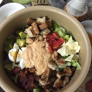我还烤了一块面包然后切丁,白煮蛋切丁,把所有切丁的食材放在蔬菜上,然后淋上千岛酱,就算完成了!除了面包之外的都是考伯色拉的基本配置,蔬菜则是随意,培根、鸡肉、鸡蛋、芝士和牛油果则建议不要省略!色拉酱用千岛比较和谐,别的也可以!