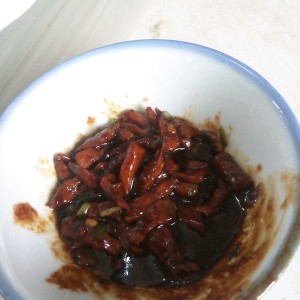 起锅放油,姜切沫当入翻炒,出味,加肉丝!肉丝变色加入豆瓣酱海鲜酱,翻炒出酱味!加入一杯水!熬汁!成粘稠状,加入葱花!翻炒!
