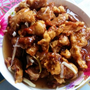 锅里放少量油,把之前调好的汤汁放入,小火慢慢熬制,待微变色变稠之后(千万千万别糊了)关火,放入姜丝葱丝胡萝卜丝,在放炸好的肉用余温拌匀既可。
