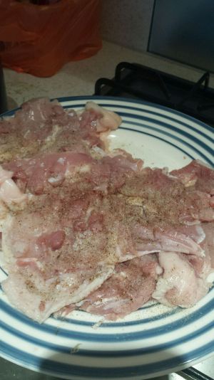 平底锅/不粘锅大火烧到中温,(我的锅烧两分钟就够热了)再把鸡肉平铺在锅里。皮面先煎。不用下油的,一定要锅热了才下鸡肉。 入锅之前再均匀地撒点盐在肉面就好了。