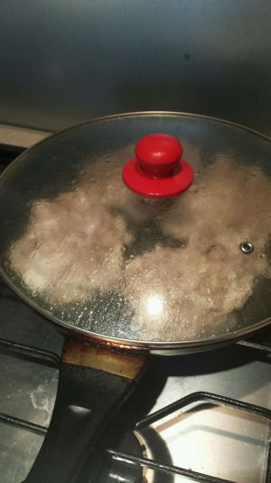 然后就盖锅盖,因为会飙水很严重。我的鸡腿排薄,手机计时4分钟就翻面了