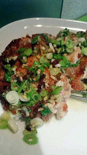 我自己喜欢味道稍重。所以用剩在锅里的鸡油炒了个简单的酱汁:小火热着锅里的油,加入蒜粒葱粒姜粒,闻到食材香味就加点盐,太干的话可以多加点油哦。翻炒盐就会融到葱姜蒜里。然后出锅撒在鸡腿排表面就好了