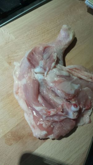 大只鸡腿去骨,鸡腿放在砧板上,骨头一般盛L,一刀下去碰到骨头就可以沿着骨头把骨肉分离,去完骨以后把鸡腿排铺平,横向切断筋。我是隔大概2厘米又划一刀