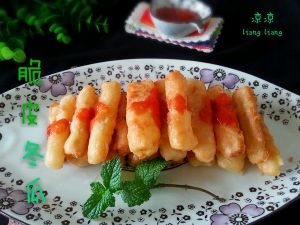 热锅热油、取冬瓜条蘸上面糊逐条下入锅中,用中小火炸约3分钟至食材熟软、捞出、沥干油装盘(炸瓜条要分次炸,不能一窝蜂全炸、炸时用筷子翻动)