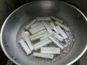 锅注入清水烧开、撒上盐适量,倒入冬瓜条煮至断生。捞出盘中。