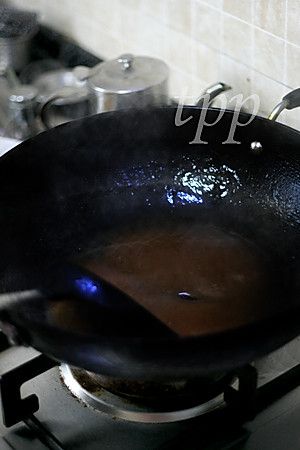 将油盛起,锅中留少量底油,加入半锅水,少量盐,鸡精,一勺老抽,两勺糖,盖上锅盖,大火烧开后改小火闷煮