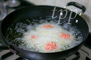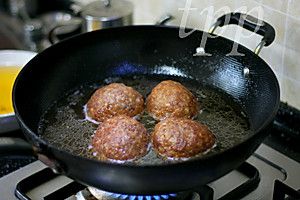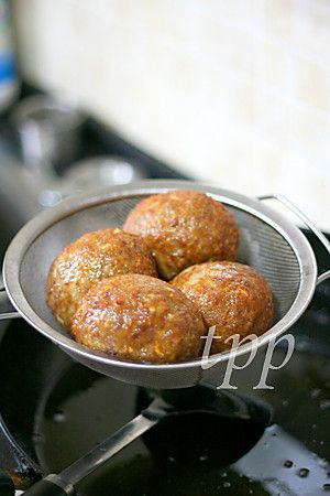 油锅倒大半锅油,油温烧至五成热时,下入丸子,小火炸至金黄
