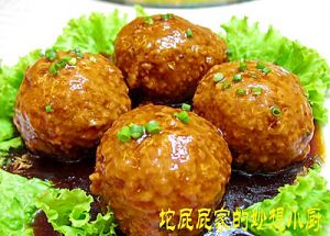 待水份差不多收干时,将丸子盛起于铺好生菜的盘中,将锅中汤汁重新烧开,加入水淀粉勾芡