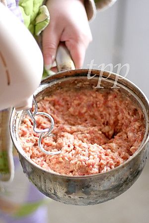 500克猪肉(肥瘦掺半)搅成蓉,加入100克生粉,两个鸡蛋,两勺盐,一勺料酒,适量鸡精,胡椒粉,一小勺老抽,切好的马蹄末,姜末,少量水,搅打上劲(打丸子这活儿最好交给机器完成,否则用手打非累死你不可)