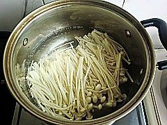 锅中水烧开放入金针菇焯烫沥干十分备用,