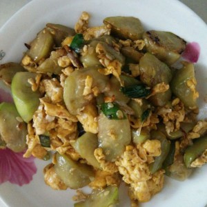 丝瓜去皮切滚刀块,鸡蛋打入碗中。