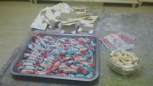 切成合适的块状,为了防止黏连到一起,可以在上面撒些奶粉,想要口感更好,其实可以用密封罐装好放进冰箱冷藏下