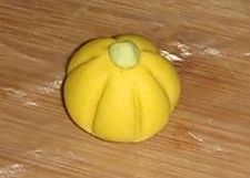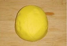将滚圆的面团放在案板上,用勺柄轻轻压出6道花纹(随个人爱好压几道花纹都可以)
