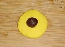 将面团分成30克一个的小剂子,用手按成圆饼状包入枣泥馅封口滚圆