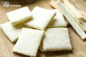 吐司烤焦的边缘切掉,并且一分为四切开;
