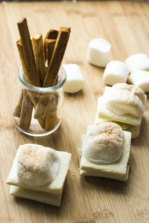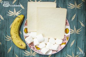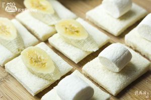 香蕉斜切成薄片,铺在四片吐司上,剩余四片吐司则放上棉花糖;