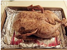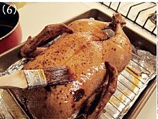 抹好的鸭子,四脚朝天,入烤箱,375F/190度,烤一个小时,其间需要拿出来至少三次再次抹烧烤汁,直到用完所有的汁。如果觉得翅膀要被烤焦了,就用锡纸裹上。这里每拿出来刷一次,颜色就会更深,更好看哦。