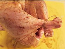 表面的抹料混合好,抹在鸭子身上,里外都要抹上,抹好后鸭肚子里放上葱,姜,蒜,陈皮,再将鸭子腿用棉线绑起来固定位置。(我这里鸭肚子里的东东放早了,也不想都掏出来的,导致我抹鸭子的时候各种不爽)