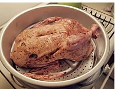 鸭子四脚朝天的上蒸锅蒸45分钟,上锅之前先在鸭子身上用叉子或者牙签戳一戳,这样油脂更易蒸出来。因为要蒸很久,所以要保证蒸锅里的水够多哦。