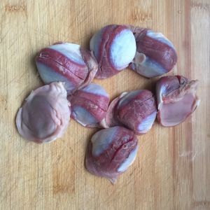 鸭肫洗净控水;每个鸭肫中间切开,四个鸭肫变成了八个、再每一个小的中间切一刀、不要切断
