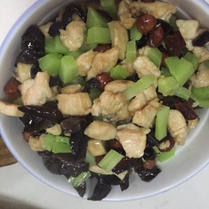 4. 倒油,加干海椒段,倒木耳,倒鸡丁。鸡丁七成熟,加莴笋。起锅。