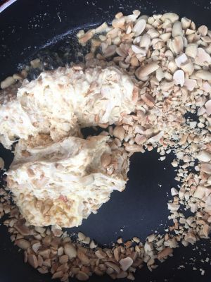 花生碎扔进去,搅拌,这步比较吃力,费劲。加大力气搅拌,小火,我用电磁炉一直是300w。