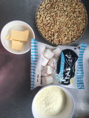 材料合照,花生在微波炉或者烤箱里烤熟,去皮,装在袋子里用擀面杖捻碎,不要太碎,大粒口感好。