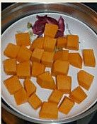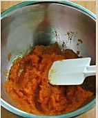 蒸熟的南瓜丁取出(蒸的时候盘里会有些水,把这些水倒掉),按压成南瓜泥