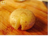 用刀背帮忙压扁小洋芋,这里压的时候力道要控制好,稍微压扁,裂开口就好,力道太大,很容易压的碎成几瓣,这样就不太好煎了。