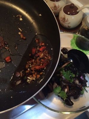 热油锅,加入辣椒、蒜、酱油、糖、盐、