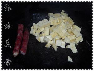 红薯削皮后,清洗干净,切成红薯丁;,腊肠冲洗干净,切成两半;