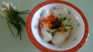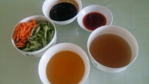 黄瓜胡萝卜洗净切丝装碗,红油裴盘,这样所有辅料准备齐了。