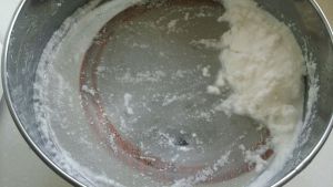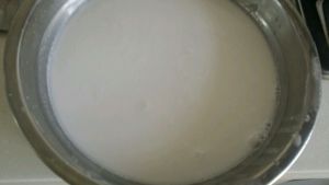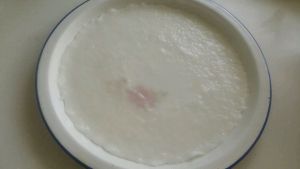 将盐放入米浆中顺时针搅拌两分钟,将100克水烧开的水倒入并搅拌匀。