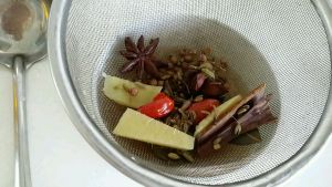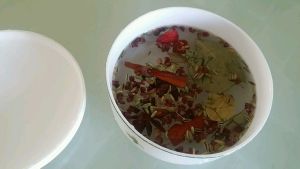 泡好的香料用小火煮10分钟关火,滤出香料汁,香料留做香料油用。