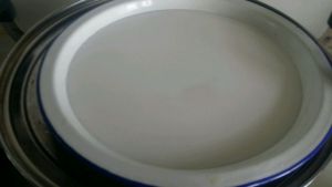 锅里放水绕开,将米浆倒入一圆盘约2mm厚,水蒸3分钟。