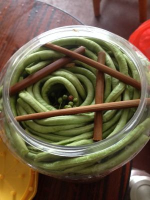 放一层豇豆上面放青花椒蒜头最后用两根筷子压实