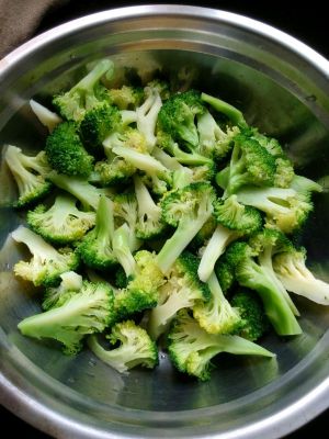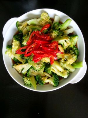 将西兰花提前浸泡30分钟,辣椒切丝备用,然后把西兰花焯熟