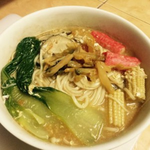 这就是打入蛋液后的面汤,略白,这样汤汁更浓郁美味~ 又将蟹棒放进去煮软即可出锅,一分钟左右吧~