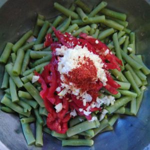 码上切好的红椒丝和蒜末。