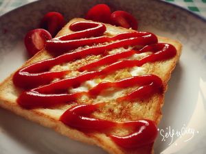 等蛋半凝固状态,放芝士片,随后把之前切下的方形吐司盖在上面,按一下后翻面,煎到面包变成金黄色就可以出锅了,挤上番茄酱,配一杯热牛奶,就是一顿简单营养的早餐。