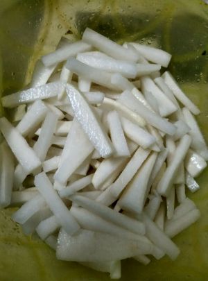萝卜洗净,不去皮(不去皮更脆),切成条,放盐,放置2个钟。