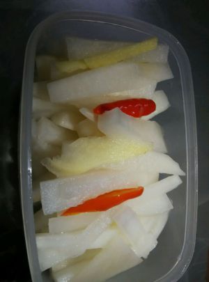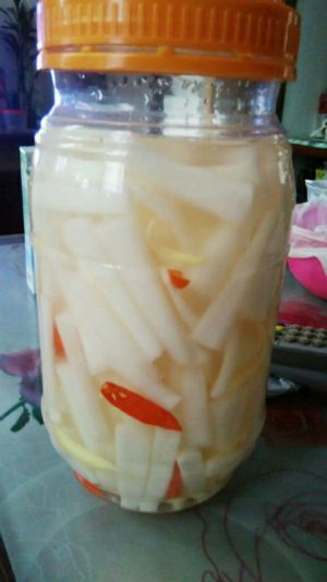 2个钟后把腌好的萝卜放入瓶子(最好用玻璃瓶),把腌萝卜腌出来的水加凉白开一起倒入瓶中,以淹没萝卜为好。放在阴凉处静置2—3天,就可以吃了(放的时间越长,越入味)