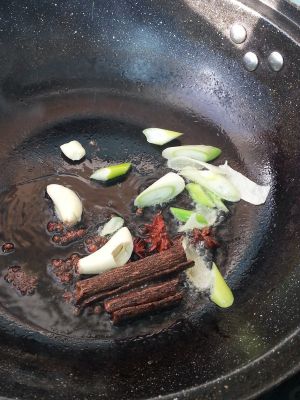 底油,花椒,麻椒,八角,桂皮,蒜,葱依次下锅