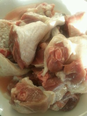 没有用整只鸭子,担心太多吃不完,所以用的鸭腿,去毛,洗净,加嫩肉粉,淀粉,黄酒,白胡椒,糖,拌均匀,腌制20分钟
