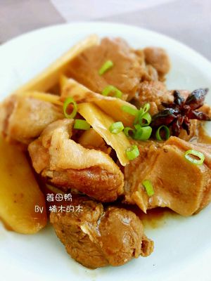 把撇净血末的鸭汤,炒过的鸭肉和姜控干油,一起放入砂锅,加半勺老抽